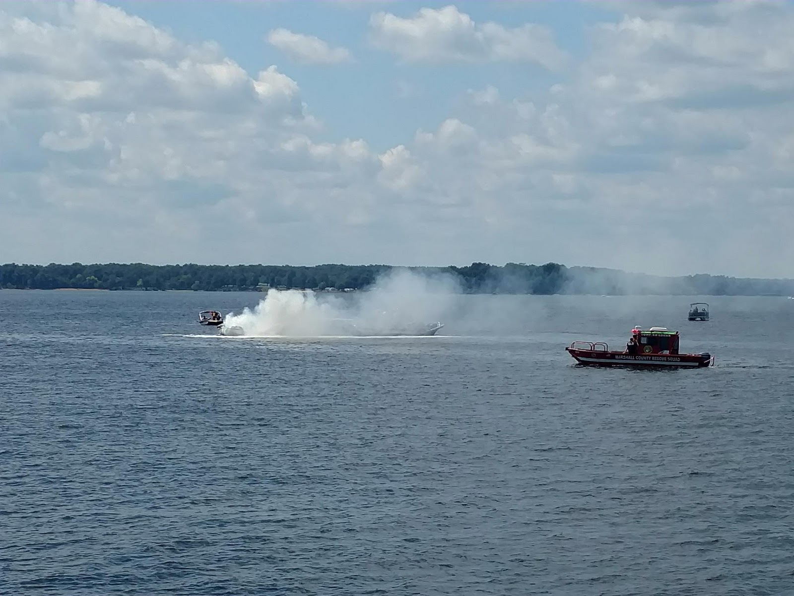 For our boating today we went down through the pass over to Kentucky Lake and boated down to a bay/cove (Nickell Branch) that looked appealing on the maps and Garmin bluecharts. On the way down, we started seeing black smoke billowing up from what appeared to be in the lake. It turned out to be a small runabout boat that had caught fire . We sat and watched for a few minutes as the fire and rescue boats arrived and sprayed it out. Pretty scary. We read online that all 3 passengers got off safely :-)